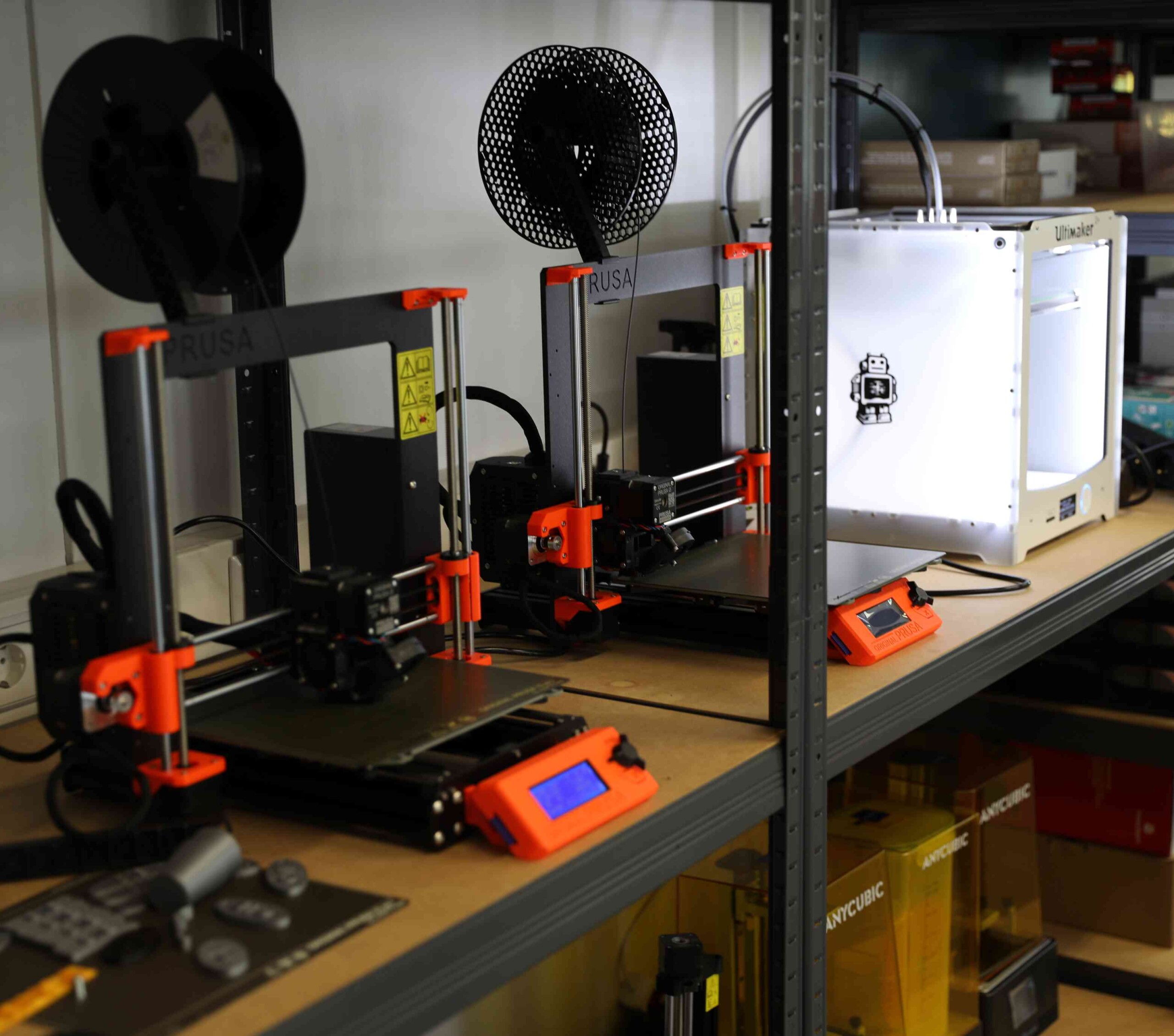 - Druckermodelle: Prusa Mini (3x), Prusa Mk3s (3x), Ultimaker 2+, Anycubic Chiron, Anycubic Harzdrucker (2x).